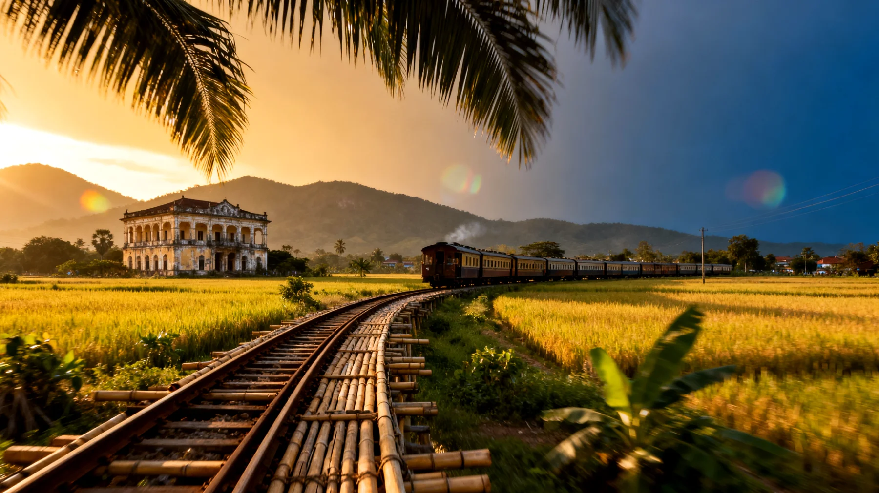 Nichts verkörpert den unkonventionellen Geist Battambangs besser als der berühmte Bambuszug. Auf einer improvisierten Plattform aus Bambuslatten, angetrieben von einem kleinen Motor, gleitet ihr durch die Landschaft. Wind in den Haaren, Reisfelder zu beiden Seiten, die Sonne im Gesicht – dieser Moment gehört nur euch beiden. Die Fahrt kostet etwa 5 Euro pro Person und dauert ungefähr eine Stunde. Ein Abenteuer, das gleichzeitig meditativ und aufregend ist.