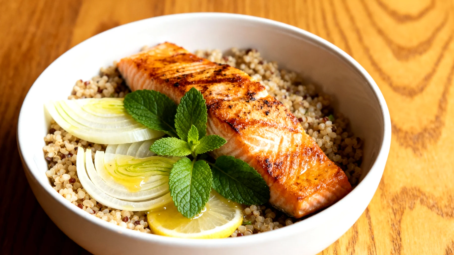 Nach einem fordernden Arbeitstag möchte niemand mit einem aufgeblähten Bauch und Verdauungsproblemen ins Bett gehen. Gerade Menschen, deren Magen-Darm-Trakt sensibel auf Stress reagiert, kennen dieses unangenehme Gefühl nur zu gut. Die Fenchel-Quinoa-Bowl mit gedünstetem Lachs und Zitronenmelisse wurde genau für solche Situationen entwickelt: Sie sättigt nachhaltig, liegt nicht schwer im Magen und kann gezielt dabei helfen, Blähungen entgegenzuwirken.