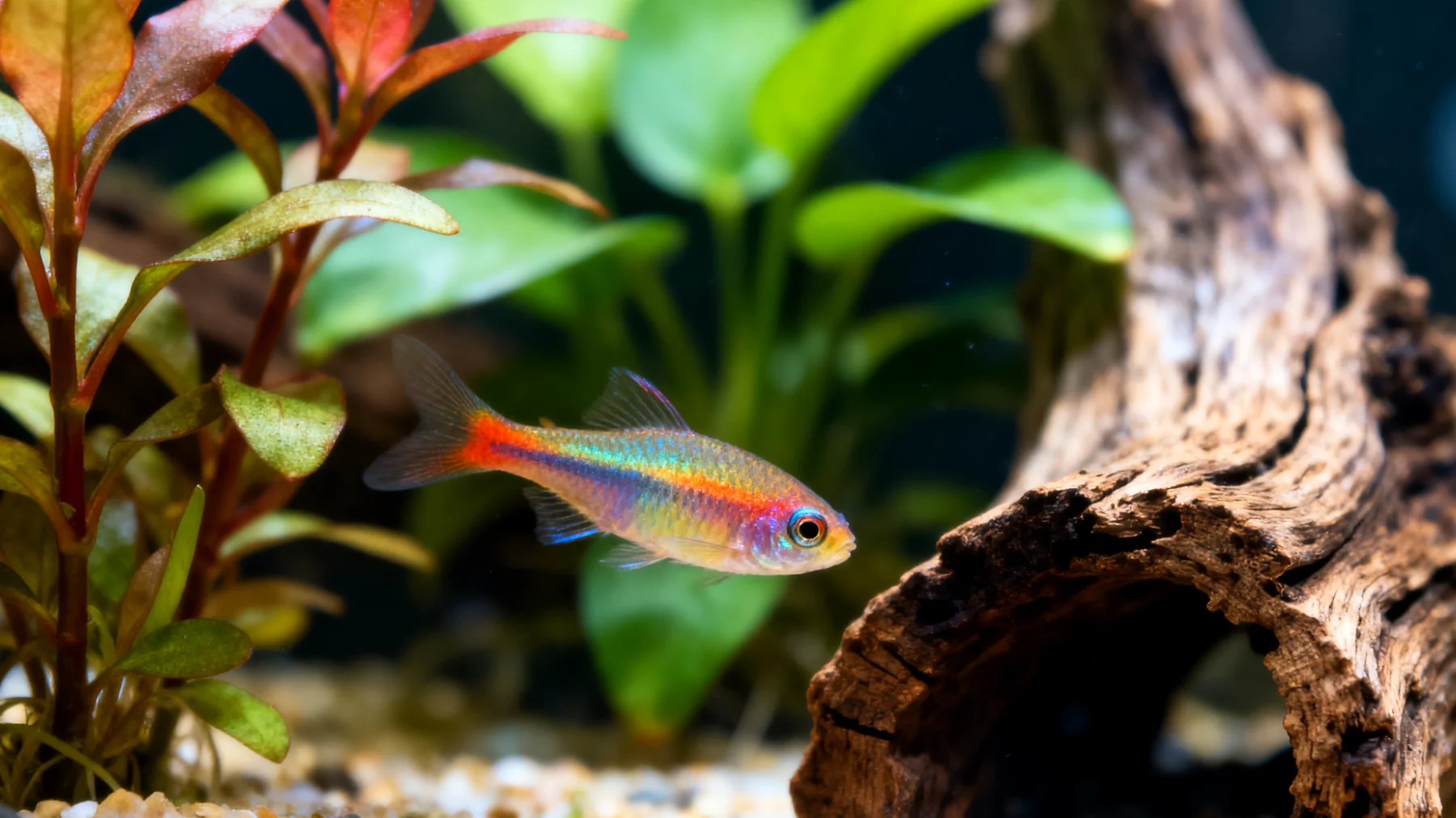 Die Kunst besteht darin, Anreize zu schaffen, ohne das Becken zu überladen. Ein 60-Liter-Aufzuchtbecken könnte folgendermaßen gestaltet sein: Eine Rückwand aus Javafarn oder Anubias, die an einer Korkplatte befestigt ist, schafft vertikale Struktur. Im Bodenbereich bilden drei bis vier unterschiedlich große Steine eine Höhlenlandschaft. Eine Ecke bleibt bewusst frei für offenes Schwimmen – auch das brauchen Fische zur Entwicklung. Wichtig ist die Veränderbarkeit: Alle zwei Wochen sollte ein Element leicht umpositioniert werden. Das verhindert stereotype Gewöhnung und fördert kognitive Flexibilität.