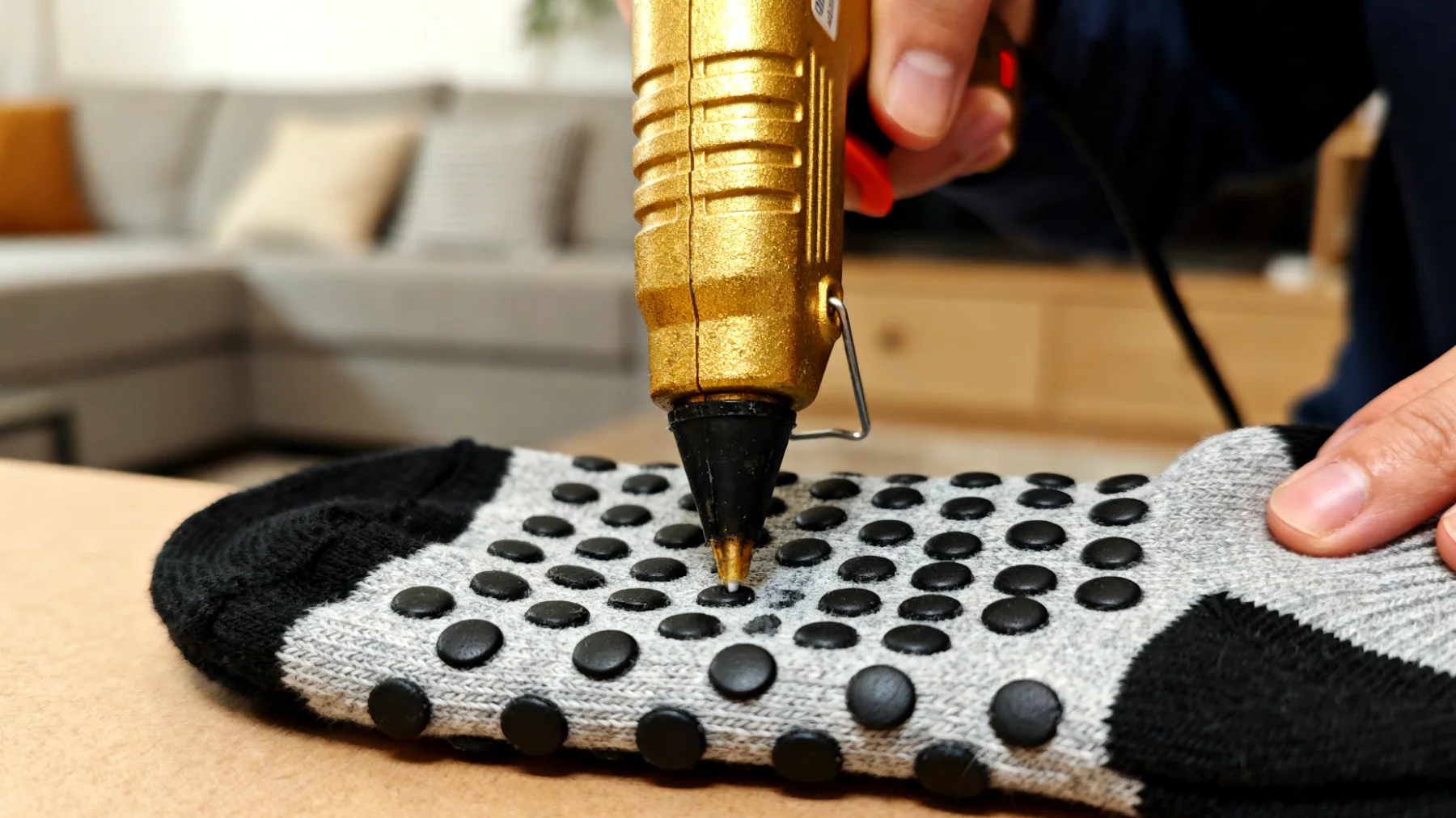 - Heißkleber auf Silikonbasis: Noch stabiler ist die punktuelle Auftragung mit einer Heißklebepistole. Dabei werden kleine, erhabene Punkte an definierten Stellen der Sohle gesetzt – insbesondere an Ferse, Ballen und Großzehe. Der Vorteil: Silikon haftet dauerhaft und bleibt auch bei wiederholtem Kontakt mit Wasser rutschfest, solange die Punktstruktur erhalten bleibt.